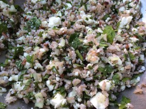 2. Put the rice in a large mixing bowl. Add the feta cheese, crumbling it, fresh herbs, garlic, lemon juice and mix.