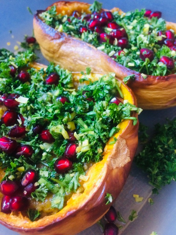 6. Dresser les demies courge dans une assiette. Parsemer de gremolata et de grains de grenades. Au goût, ajoutez un filet de Tahini.