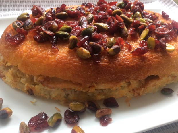 - Garnish the Tahdig with pistachios and cranberries. Serve immediately.