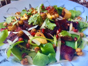 Purslane salad with roasted beets and rutabaga, maple and lime vinaigrette