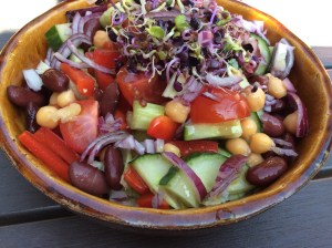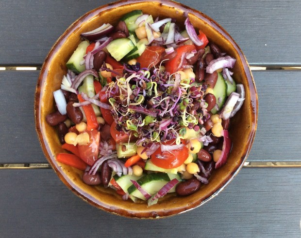 - In a bowl, tear the lettuce into small pieces. Add as many strips, wedges and chunks of vegetables as you want. Add the peas and beans then a small handful of sprouts. Finish with the sauce or vinaigrette.