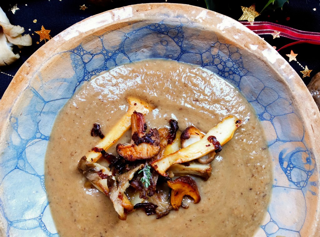 You must first sauté onions and wild or forest mushrooms so that they reveal their sweet and woody tastes, then you simmer them with a good homemade vegetable broth. To be in tune with the season then, to obtain the smoothness of the cream without really adding any, as well as to maintain a common thread in my menu of this Christmas 2022 series, I add chestnuts.