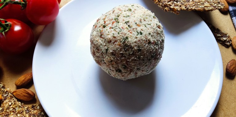 Put the pulp in a bowl and add the other ingredients (see recipe: yeast, herbs, oil, vinegar and salt). Using your hands, form a tight ball. If you wish, you can coat your cheese ball with crushed almonds. Leave to cool in the refrigerator for 3-4 hours.