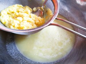 - Dans un grand bol avec une passoire, versez le contenu à travers celle-ci pour récupérer la pulpe*. Pressez pour bien retirer tout le jus.