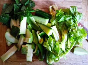 Outre la menthe de mon jardin, j’ai aussi les feuilles de céleri dont je t’ai parlé la semaine dernière. Tu sais celles que je garde séparément des tronçons. Si j’ajoute ces deux ingrédients à ce qui traîne dans le fond de mon bac à légumes -un tronc de brocoli, un bout de concombre et un poivron qui commencent à flétrire – j’obtiens un jus de légumes verts super hydratant et frais qui répond à mon effort de ne rien jeter, de ne rien gaspiller