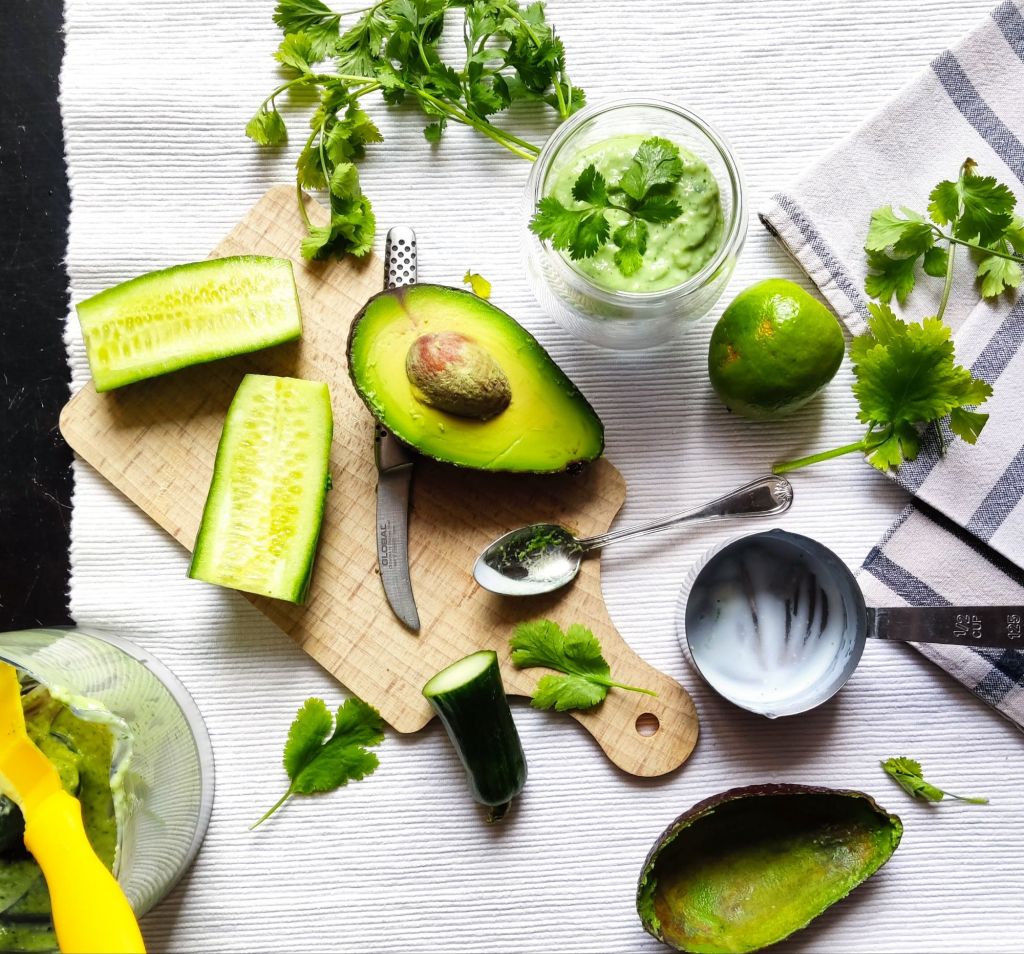 - Dans la cuve d’un mélangeur, ajoutez l’avocat épépiné et pelé, le tronçon de concombre (pelé ou pas), la poignée de feuilles de coriandre fraîche, le jus d’un demi citron vert, 1 à 2 pincées de sel et le lait fermenté. Mixez jusqu’à consistance lisse et homogène. Rectifier l’assaisonnement et la consistance en ajoutant du sel, du jus de lime et du lait fermenté au besoin.