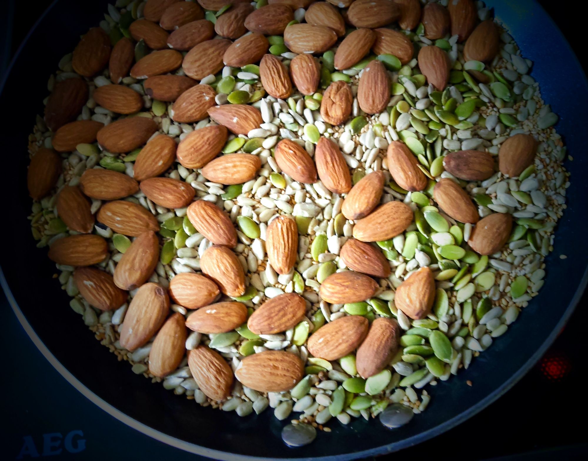 - Roast the almonds and seeds separately. Let cool completely.