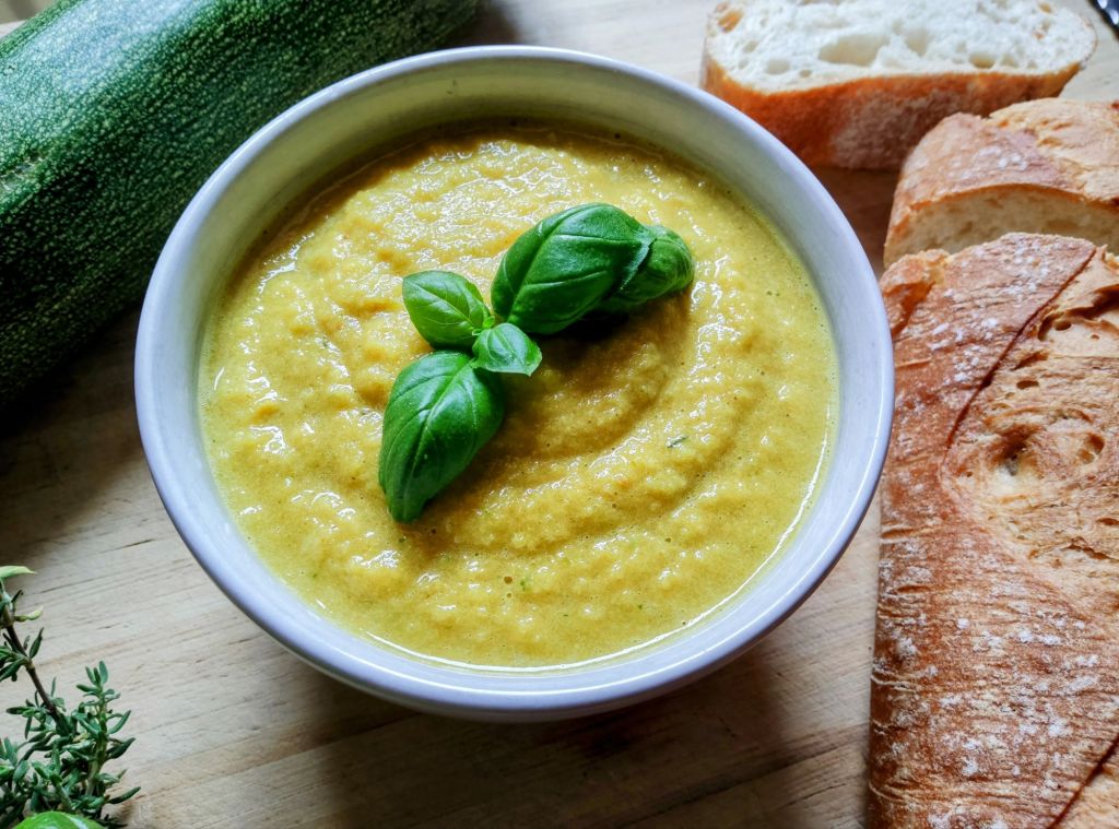 - Place the zucchini and onions in the blender with the water, oil, vinegar, lemon juice, basil and thyme leaves, a tablespoon of turmeric, and a pinch of salt and pepper.