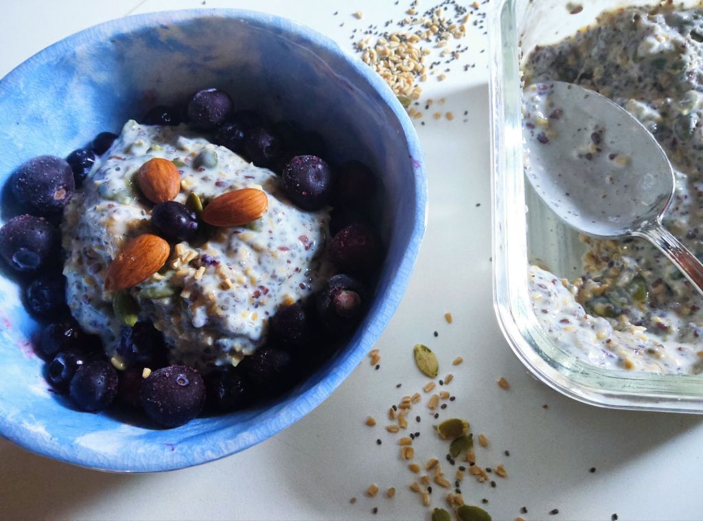Pour ajouter encore plus de protéines au gruau cru, j’ajoute des graines de potirons, de chia et de lin ainsi que de la poudre de lactosérum ou de soja. La protéine en poudre est un choix facile et pratique. Tu pourrais préférer le skyr, le petit-suisse, le yaourt grec ou les œufs. Mais la poudre végétalienne ou de lactosérum est super pratique, se dilue facilement avec un liquide froid et contribue à un apport protéique important sans le volume. Pour 80g de protéines je dois manger environ 800g de skyr, ce qui ne fait pas de sens. Dans ce cas, l’utilisation de la protéine en poudre est bien plus pratique pour en consommer une plus grande quantité dans un plus petit volume!