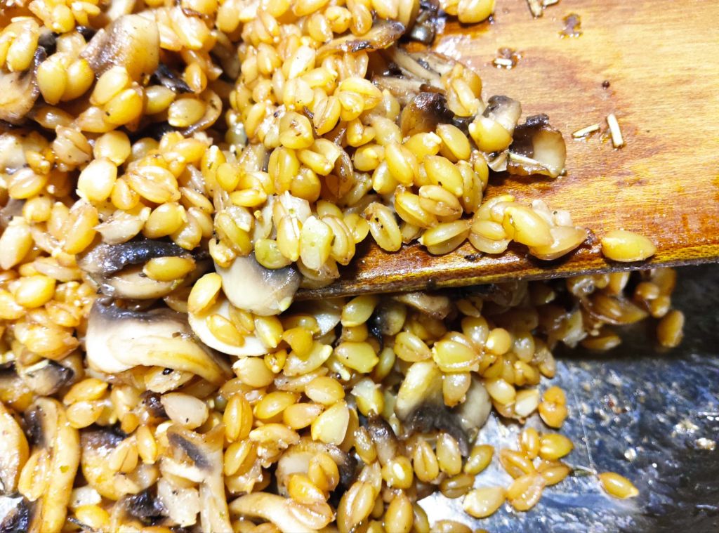 - Add the cooked spelt and sauté with the mushrooms. A few minutes is all it takes. Adjust the seasoning.