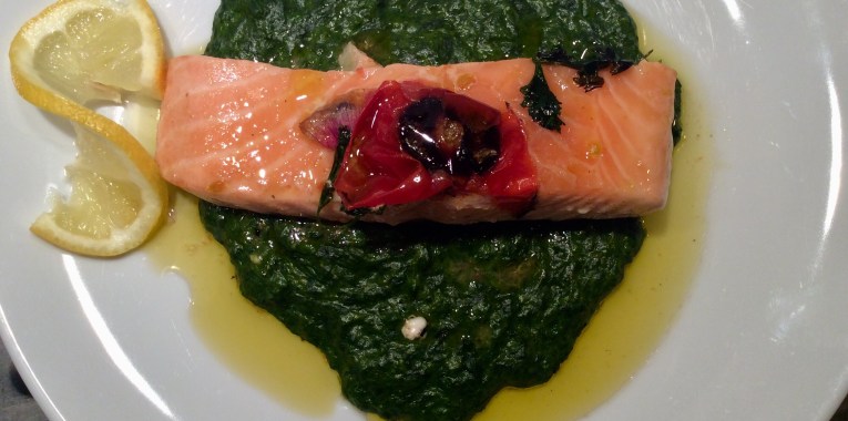 Salmon Confit on a bed of Creamed Spinach / Saumon confit sur lit d’épinards à la crème