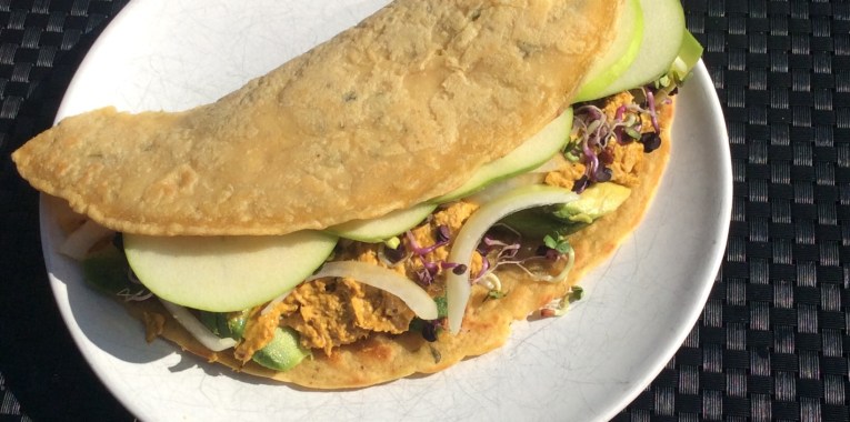 - Mettre la galette dans une assiette et y déposer sur la moitié face à vous, en couches successives, les tranches d’avocats, le thon mayonnaise, les pousses germées, l’oignon et la pomme. Refermez la galette.