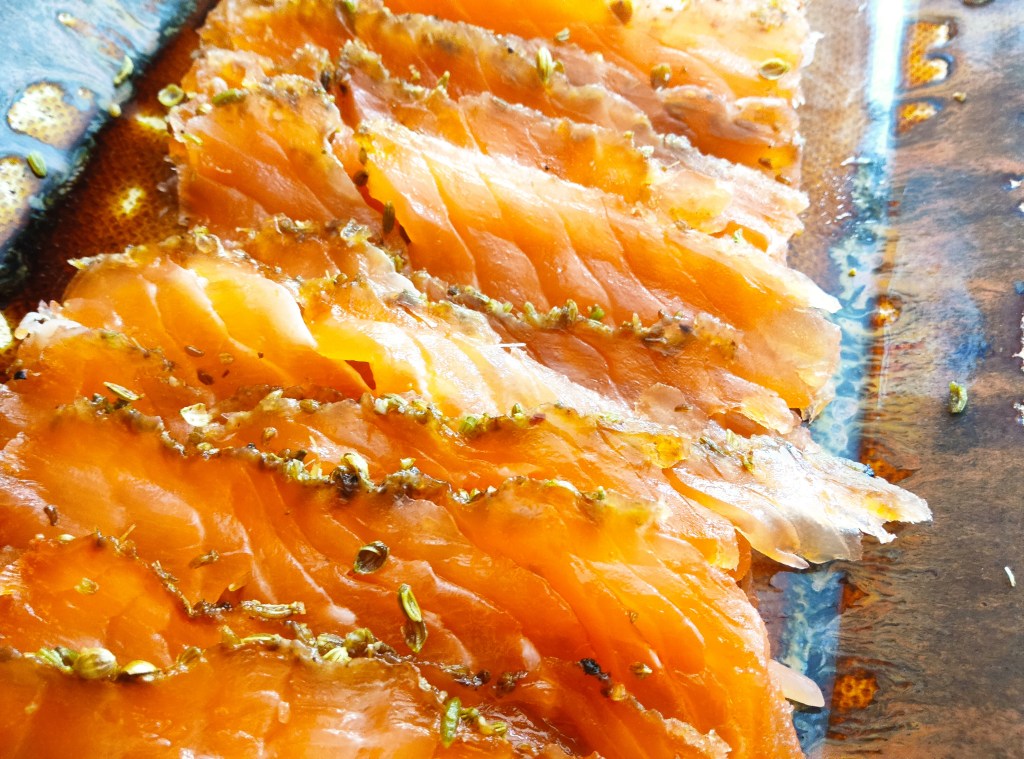 Gravlax (which means “buried salmon”) is a specialty of traditional Nordic cuisine. In the Middle Ages, fishermen put their salmon in a brine of sea salt and dried and fermented it in jars which they buried in the sand.