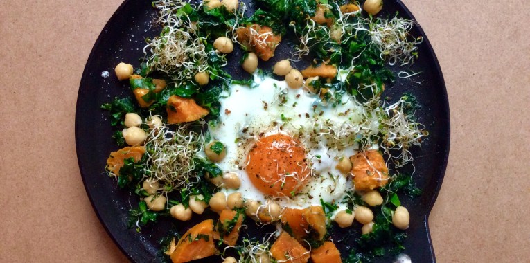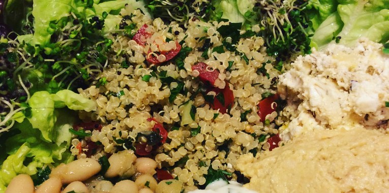 It’s simple: salad and chicken! But there’s more… the salad is a bed of spinach, the chicken is marinated in Mexican chili and chipotle spices. There are also some pickled red onions, einkorn, black beans, and chunks of 15-month aged cheddar. The whole thing is topped with a chili skyr-based sauce.