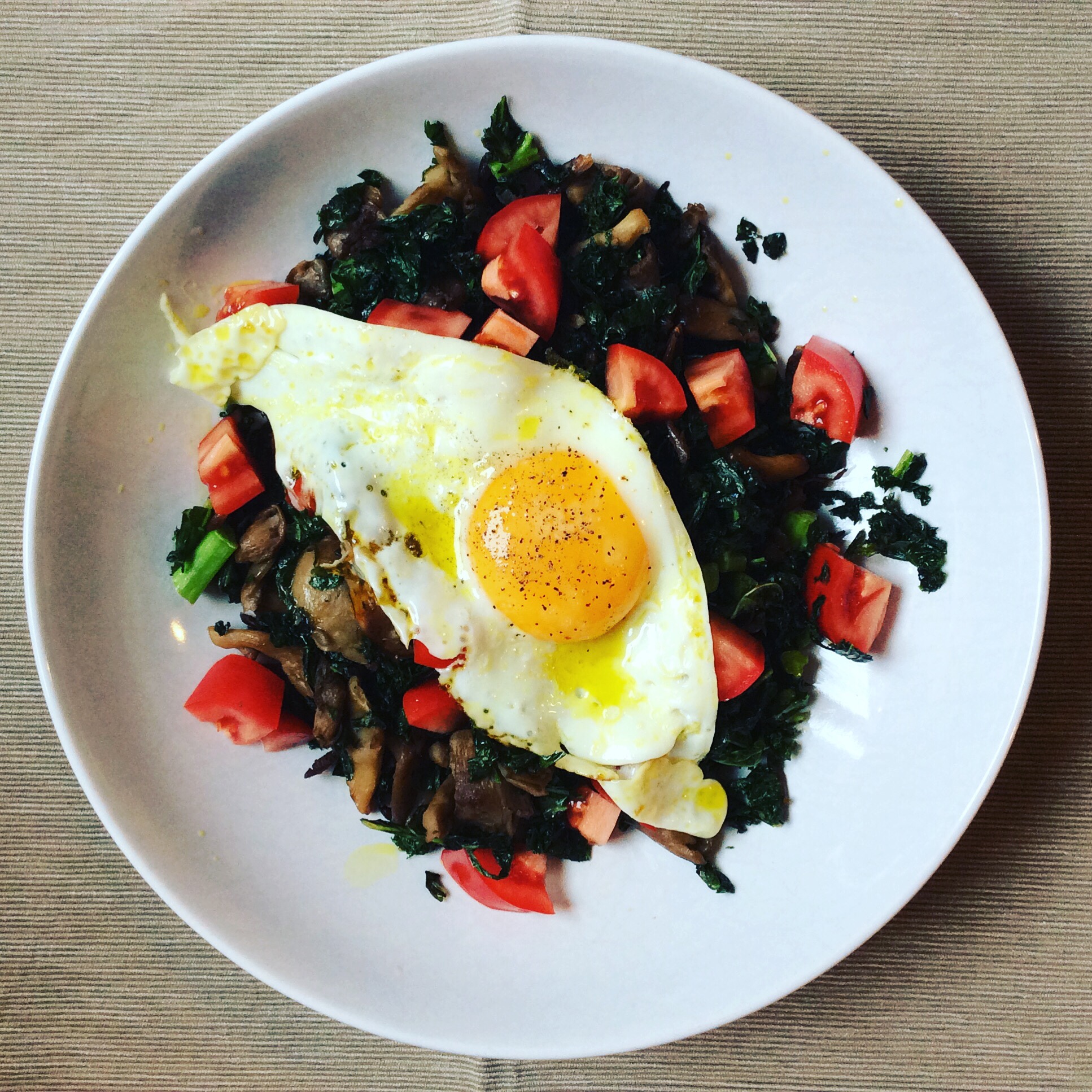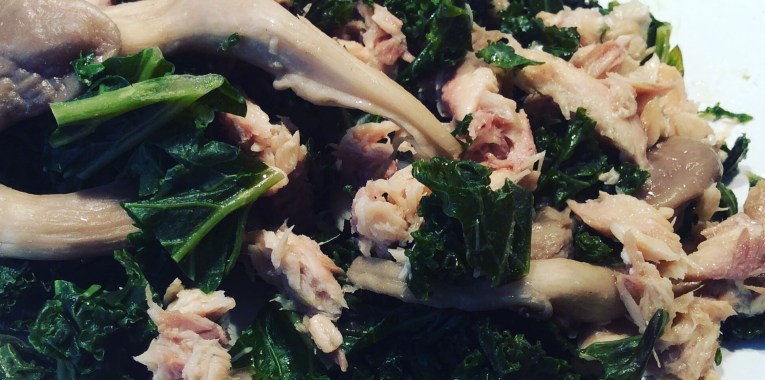 Take 4-5 large Kale leaves washed and chopped. Cut oyster mushrooms or any kind of mushrooms and saute them with the cabbage, salt, pepper and a pressed clove of garlic in a pan on medium heat. When cooked, transfer to a plate or bowl.
