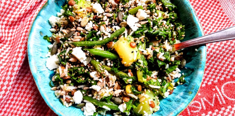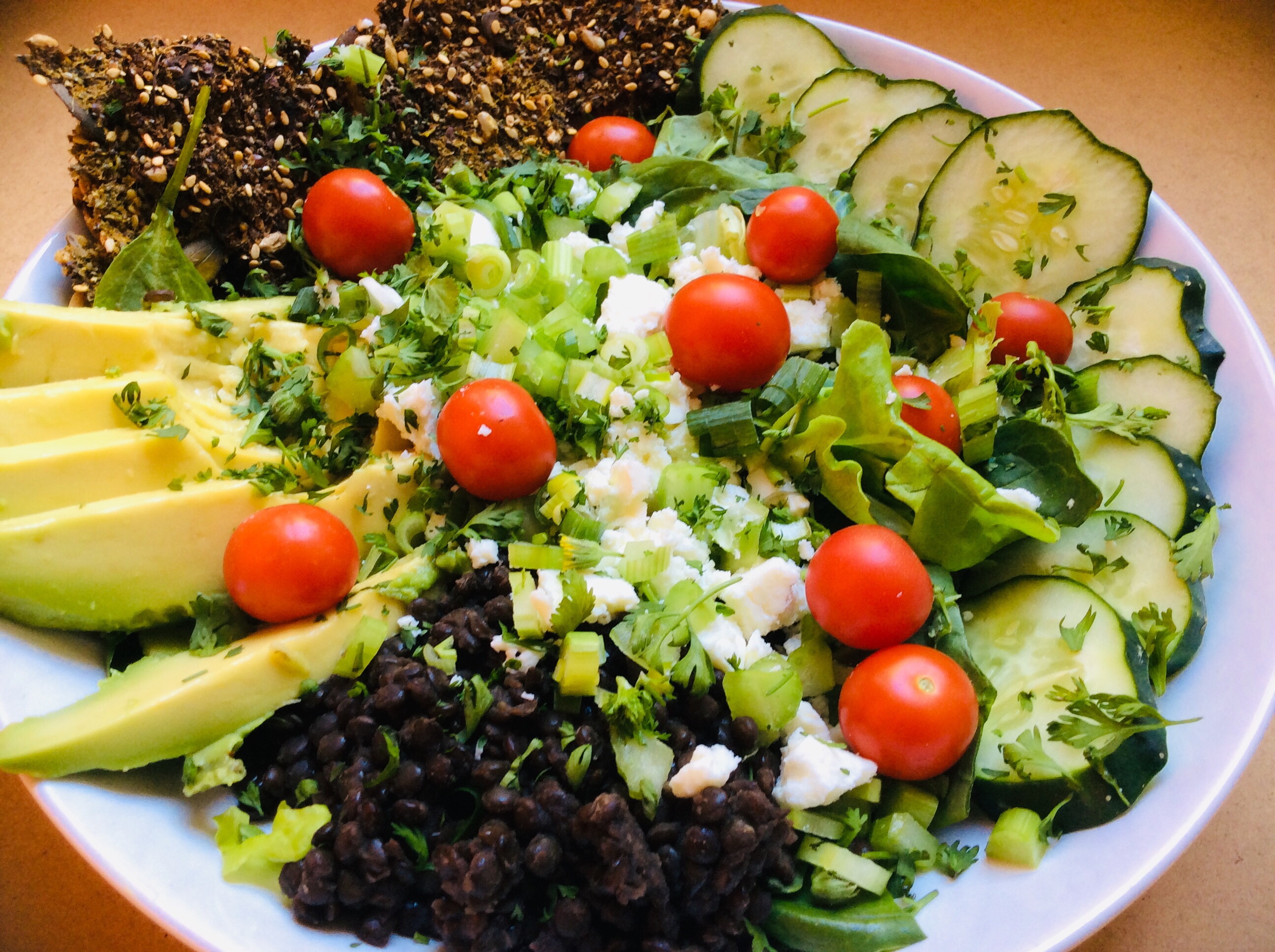 J’ai choisi d’utiliser des feuilles d’épinards frais comme base de salade mais tu pourrais choisir la laitue ou n’importe quelle autre feuille que tu as dans ton frigo. Ensuite, j’ai ajouté mes pickles d’oignons rouges que je fais régulièrement et que j’ai en permanence dans mon réfrigérateur, le petit épeautre cuit qui reste d’hier, les haricots noirs (maison ou en conserve) qu’il me restait mais qui pourrait être remplacé par des haricots “red kidney”.