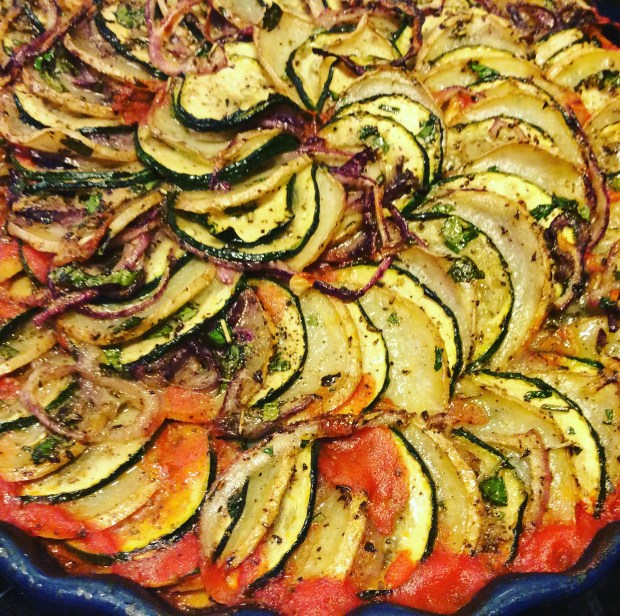 Évidemment, tu peux assembler le plat en disposant les légumes en alternance pour faire jolie mais, si tu n’as pas le temps ou l’envie, ce n’est absolument pas nécessaire. Le résultat et le goût sont tout aussi bon!