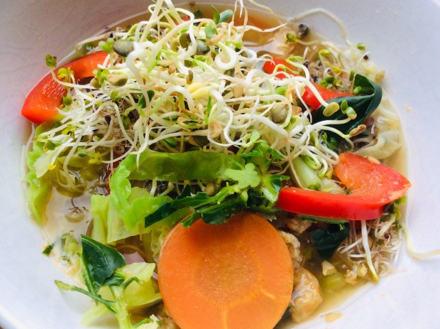 Sur un lit de zoodles (spaghetti de courgettes) j’ajoute un confit de tomates, oignons et ail ainsi que du fromage Feta grillé. Voilà un petit repas facile qui se mange chaud ou tiède et qui est sans gluten et végétarien.