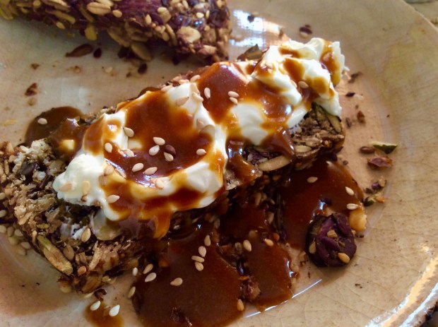 L’ananas grillé ou caramélisé est super bon en soi mais, cela manque de finition. Un peu de yaourt de coco, des petites graines de sésames, de potirons ou de tournesol puis un filet de pekmez (sirop de dattes) ajoutent une touche finale qui harmonise et crée un délicieux plat.