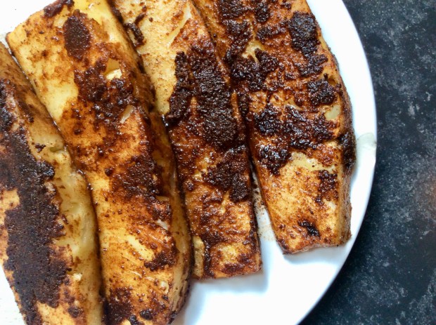 Yesterday was my son’s 12th birthday who had asked for a Brazilian meal with some Minas Gerais specialties on the menu AND especially grilled pineapple with cinnamon. So I cut quarters, flavored them and then roasted them in the oven. This morning there were a few ungrilled wedges left. No way to throw them away! There are too few to start a BBQ or an oven. How about caramelizing them in a pan? That’s a cool idea for my breakfast!