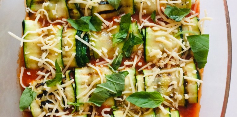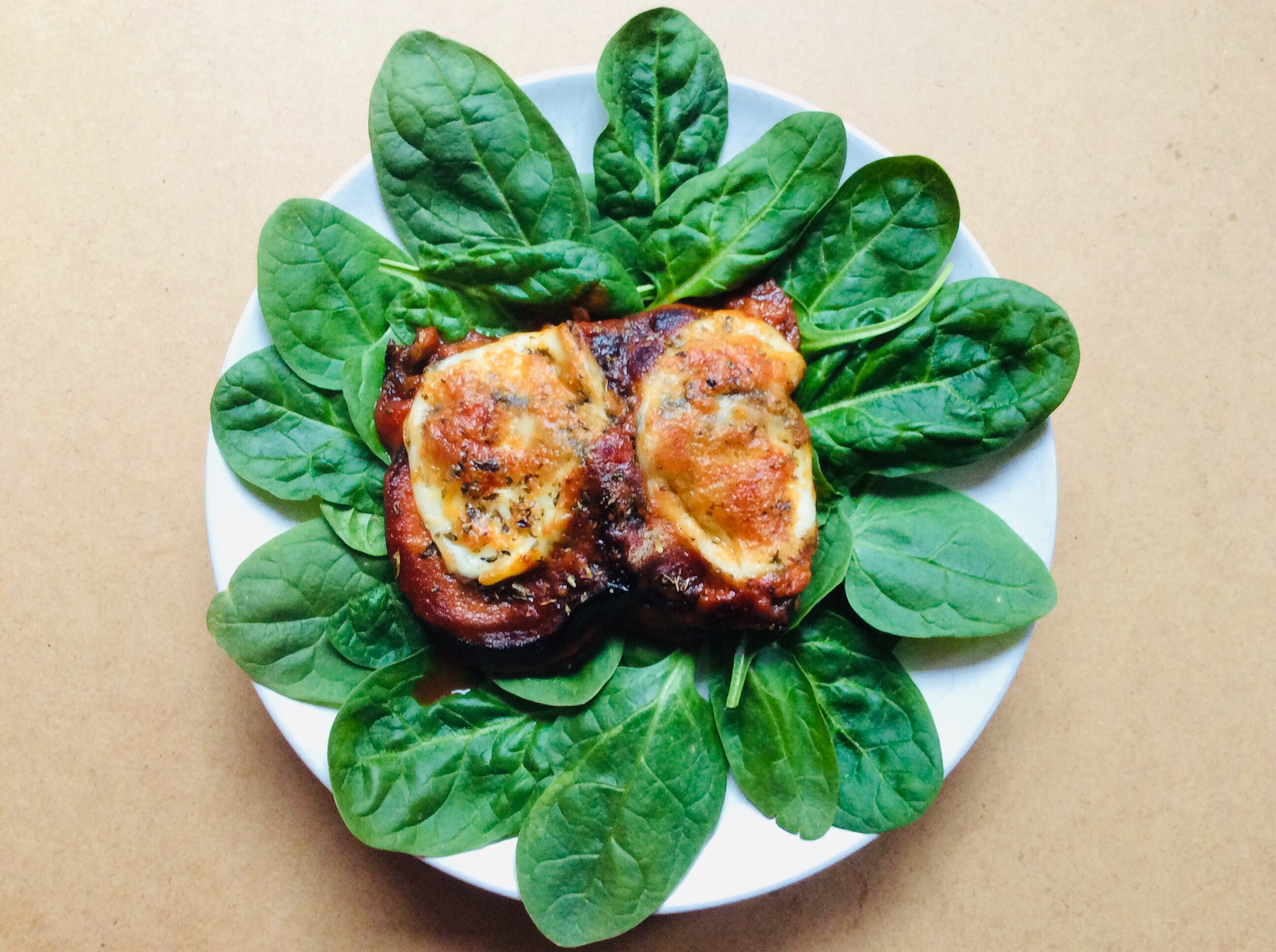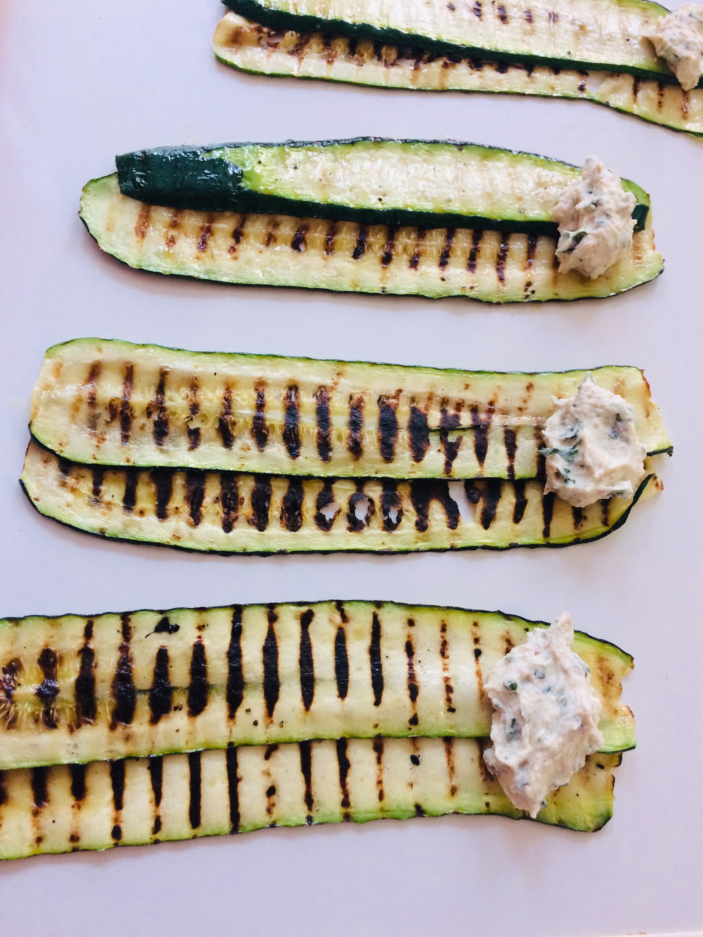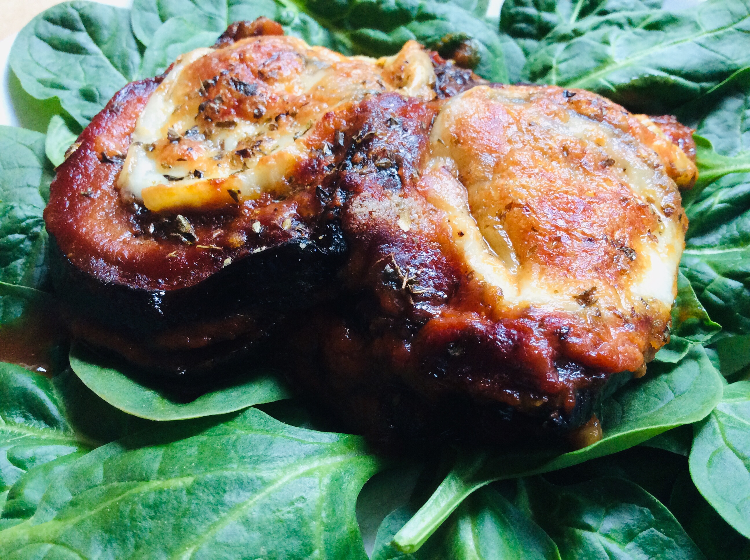 Grill the eggplant slices either in a cast iron pan or in the oven. To do so, brush each side of each slice with extra virgin olive oil. Place on the hot cast iron pan and turn half a turn to make a nice grid on each side. Or, put on a baking sheet and broil in the oven. Turn as needed. Let stand and cool. Reserve.